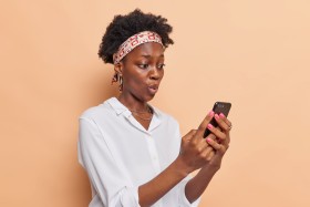 surprised woman smartphone reaction expression shock amazed phone technology portrait emotions mobile texting social media communication young curly hair face news unexpected funny candid lifestyleSimilar Photos